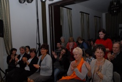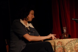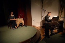 Valentyik Anna szinkronszínész, előadóművész műsorának képei a Halász Móricz-kúriából. Zongorán kísért: Oláh Gergely.