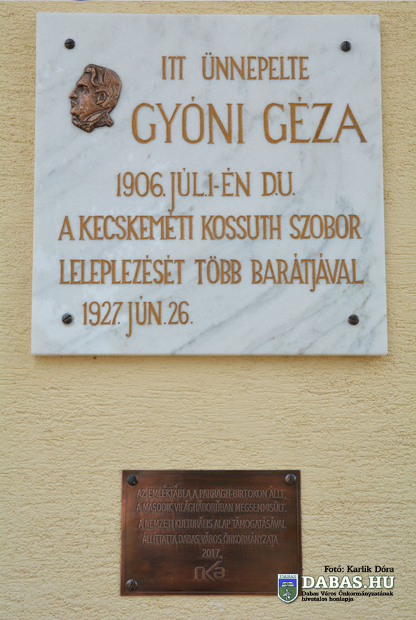 Az eredetileg 1927-ben felavatott emléktábla Dabasi-szőlők egyik első mementója volt, amelyet a Nemzeti Kulturális Alap támogatásával állított helyre a város önkormányzata. A tábla azt az eseményt örökítette meg, hogy Gyóni Géza itt ünnepelte meg a kecskeméti Kossuth-szobor leleplezését több barátjával. Az emlékhely sokáig, egészen a pusztulásáig meghatározó helyszíne volt az évente megtartott Gyóni Géza megemlékezéseknek.