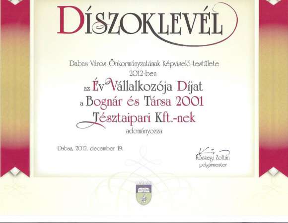 Termékeik kiváló minőségük miatt jól ismertek és keresettek a hazai és nemzetközi piacon, jó hírét viszik városunknak. Tevékenységüket Dabas Város Önkormányzata 2012-ben az Év Vállalkozója Díj adományozásával ismerte el.