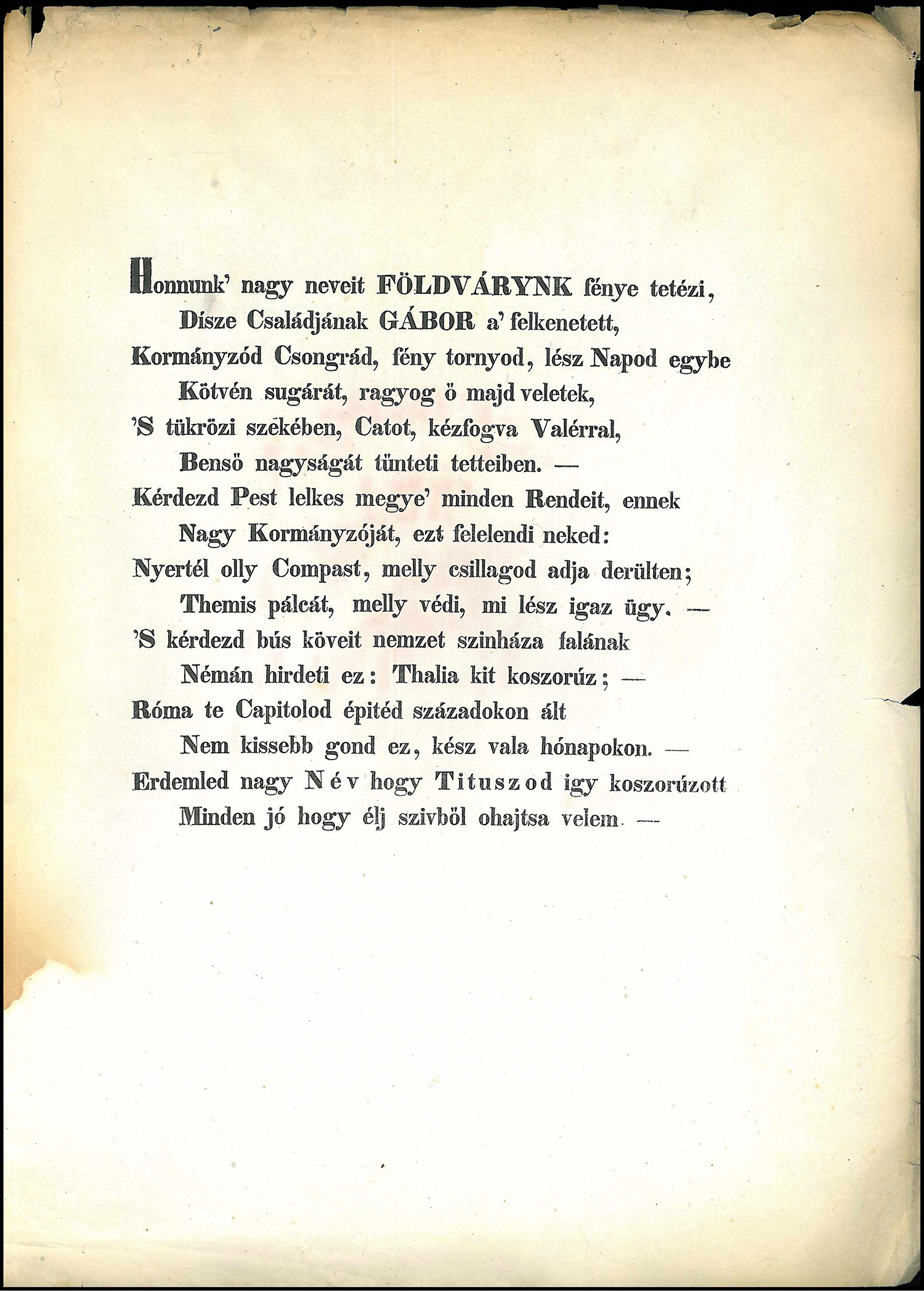 - Örvendező versek, melyekkel méltóságos bernáthfalvi Földváry Gábor úr tekintetes nemes Csongrád megye főispányi helytartója, császári királyi tanácsos ő nagysága iránti legforróbb tiszteletét kijelenteni kívánta Dabasi Halász József ... midőn ő nagysága ... Csongrád megye' főispány helytartói hivatalába leendő beigtatását ünnepelné, s' kormányzói székét ünnepélyesen elfoglalná Tavaszhó 10-kén 1843. Pesten, 1843, Trattner-Károlyi betűivel. 3. p.