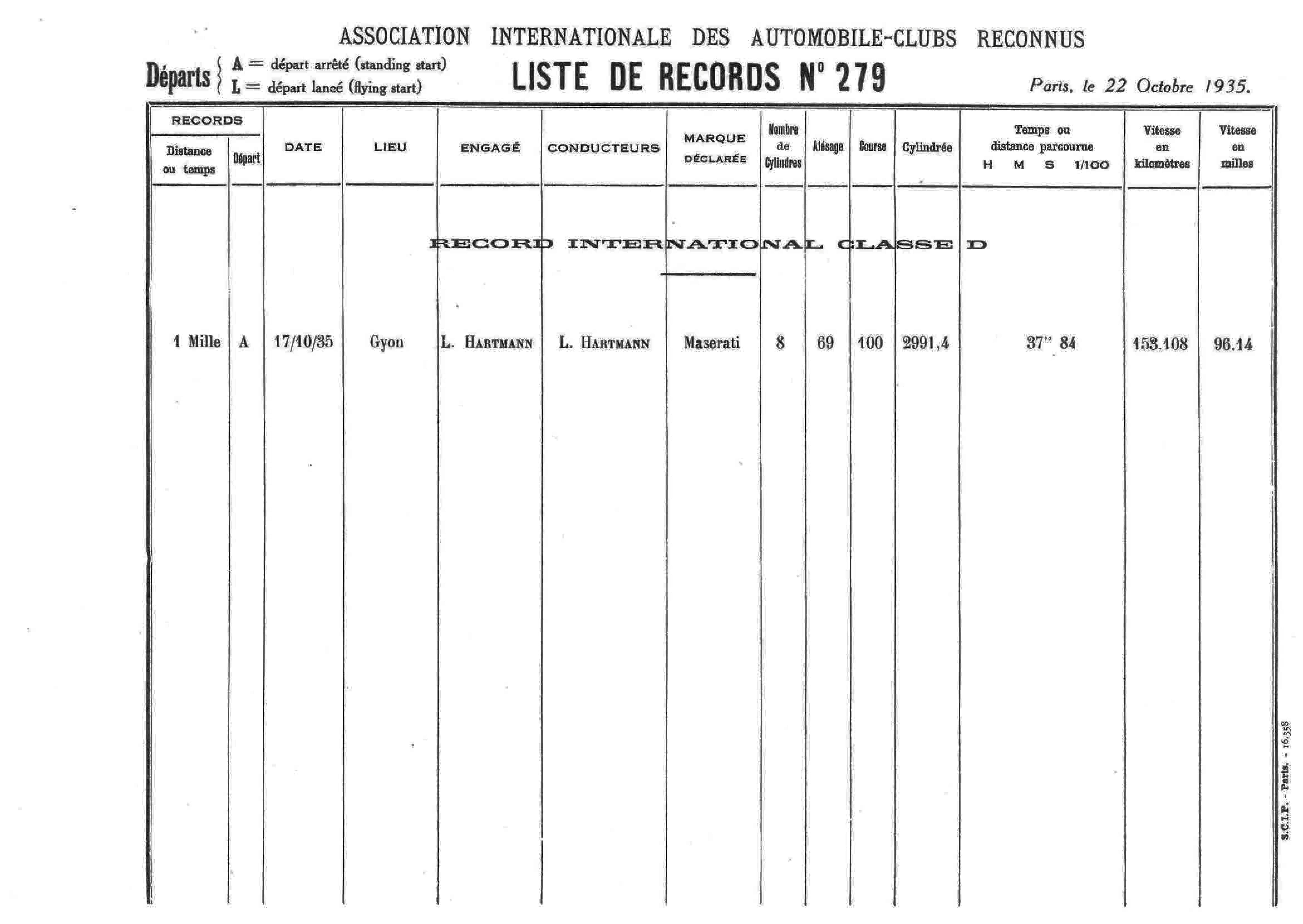 Hartmann egyszer egy irányban jóval 220 km-nél is nagyobb sebességgel haladt, amely jobb, mint a fennálló repülőstartos világrekord, eredménye azonban nem hitelesíthető, mivel csak egy irányban érte el. Hartmann eredményét Maserati kocsin érte el.”