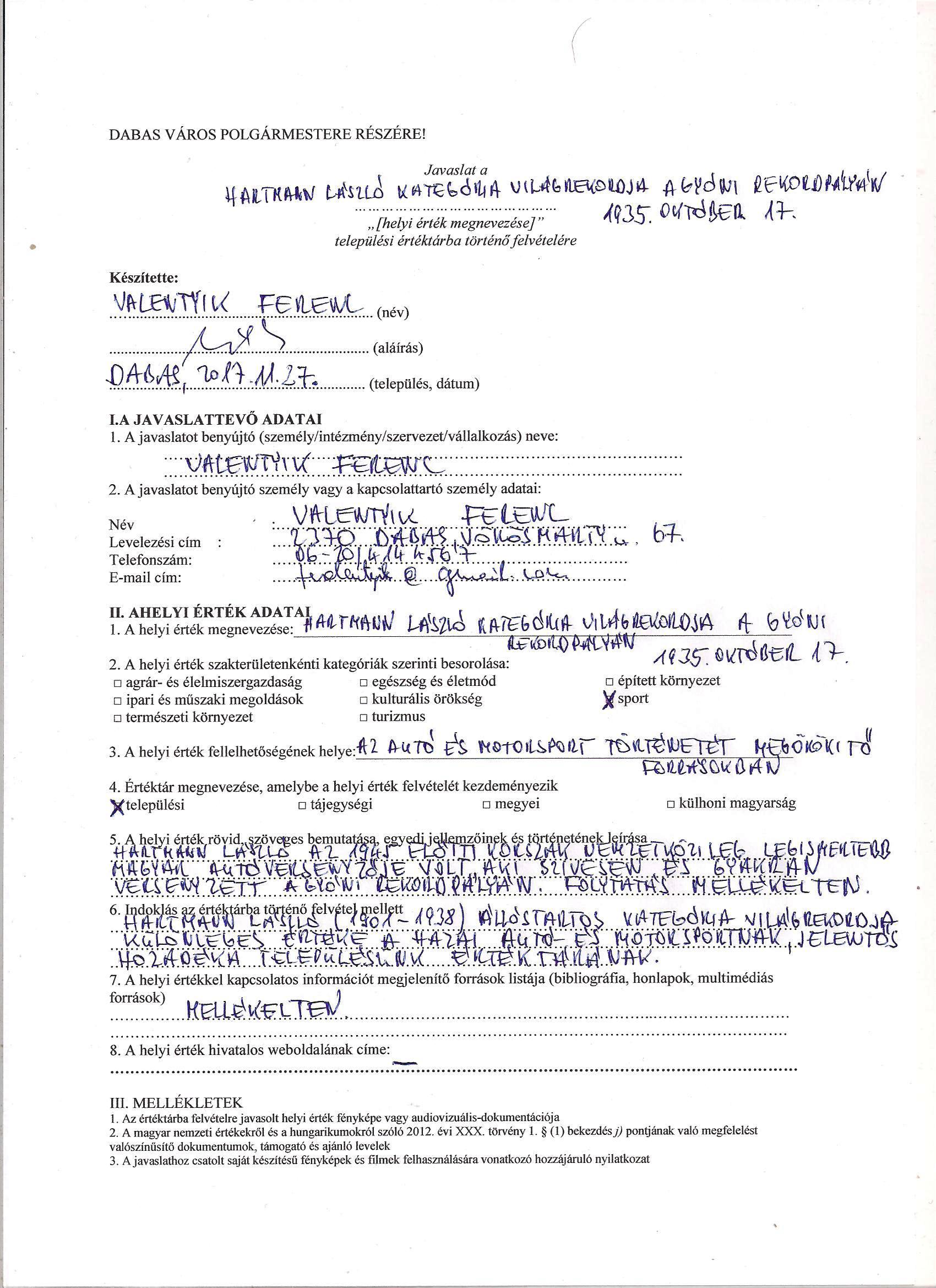 | Javaslati adatlap: |