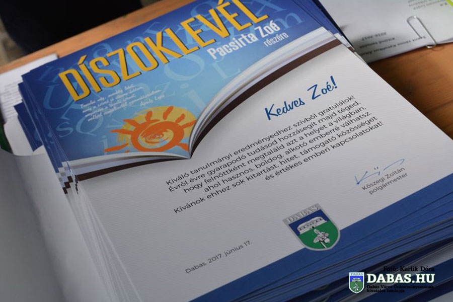 Az Év Dabasi Diákja kitüntetésekben az idei esztendőben sokéves kiváló tanulmányi eredményük, közösségi munkájuk alapján a képviselő testület Misek Bettinát, a Gyóni Géza Általános Iskola ballagó diákját, valamint Faragó Ádámot a Kossuth Lajos Általános Iskola végzős tanulóját részesítette.