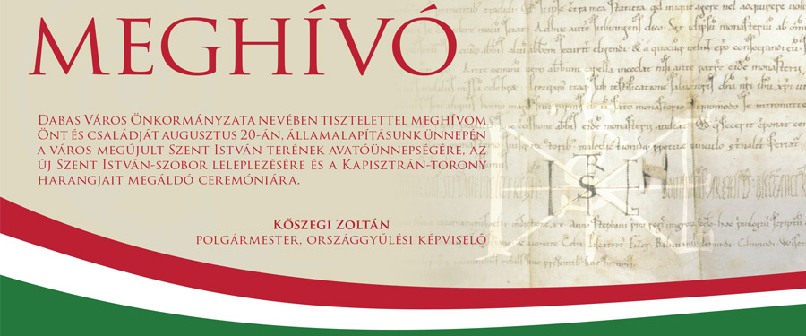Dabas Város Önkormányzata nevében tisztelettel meghívom Önt és családját augusztus 20-án, államalapításunk ünnepén a város megújult Szent István terének avatóünnepségére, az új Szent István-szobor leleplezésére és a Kapisztrán-torony harangjait megáldó ceremóniára.