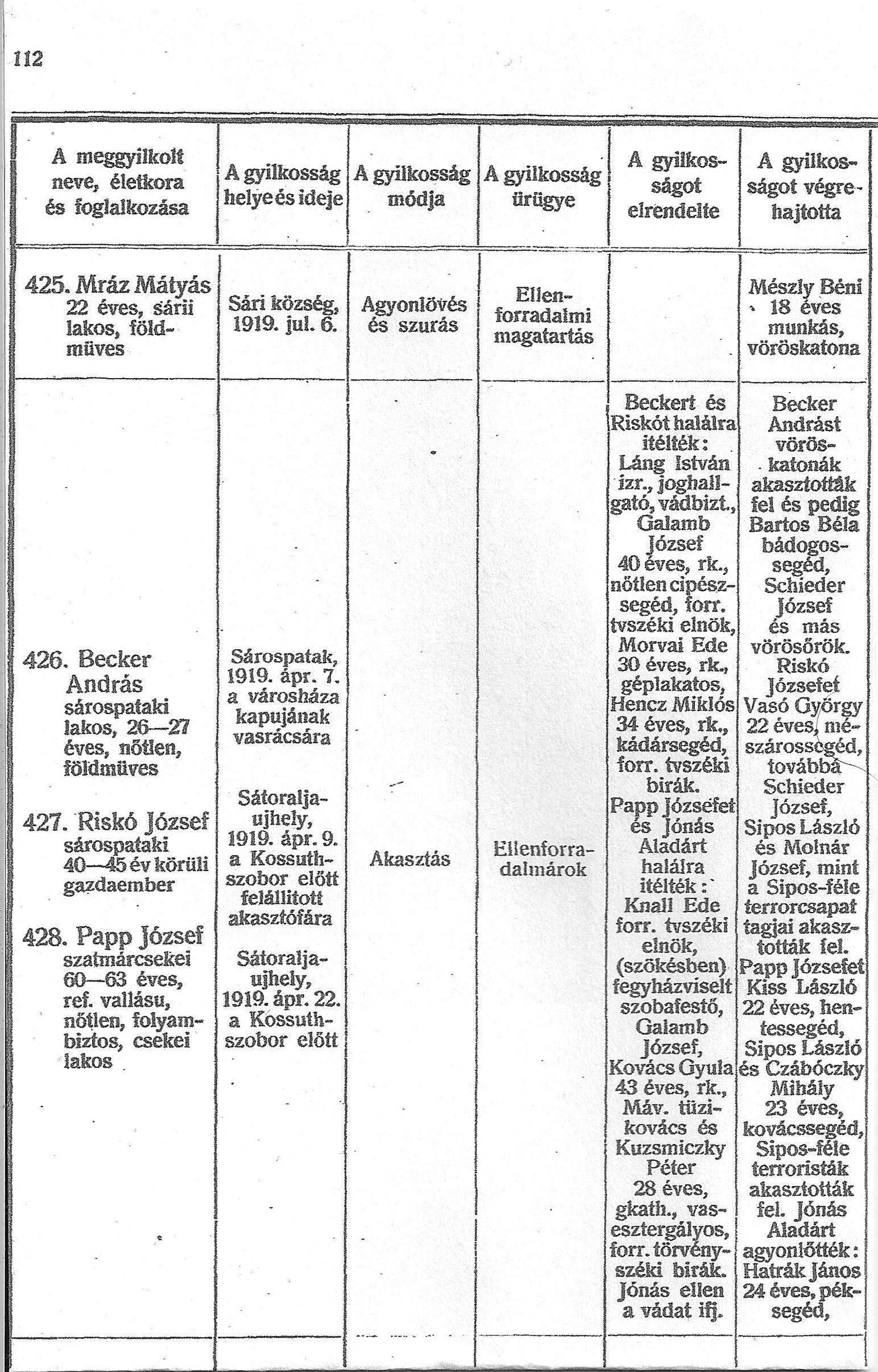 A 425. számú áldozat Mráz Mátyás földműves, akit Sáriban, 1919. július 6-án szúrással és agyonlövéssel gyilkoltak meg. Az eset leírása a vármegye lapjában a következő: „Működésük, kihívó magatartásuk és erőszakoskodásaik oly elkeseredést szült a gazdák között, hogy 1919. július hó 6-án azok lázongásban törtek ki, mely alkalommal az ott székelő 1/46. vörös zászlóalj fegyverét használta s a tömegre lőtt. A fegyverhasználatnak egy ártatlan áldozata is volt: Mráz Mátyás gazdaember több lövéstől találva, holtan esett össze. A lázadás következtében a vörösök a lakossággal szemben a legnagyobb fokú bizalmatlansággal viseltettek. Ezért volt az állandó zaklatás és a folytonos kényszerrekvirálás. Matlon János plébánost és Bogdánffy Kálmán h. jegyzőt állandóan figyelték, zaklatták, lakásaik egy részét lefoglalták s oda beköltöztek. Matlon János plébános hálószobájába Kecskés Elek vörösőr két társával belőtt s a lelkész majdnem merényletnek áldozata lett.” Czagányi László a 2010-ben kiadott „Ezer dabasi pillanat” című munkájában így idézte az eseményt: „Jellemző végül az is, hogy Sáriban másodszor épp ekkor folyt vér, amikor az itt állomásozó vörös zászlóalj a tömegbe lőtt. A négy év háborús megszorításai után elrendelt „ló-pótsorozást” ugyanis nem tudta teljesíteni az amúgy is igavonó állatok szűkében lévő lakosság. Amikor ellenálltak, a vörösök fegyverüket használták.”