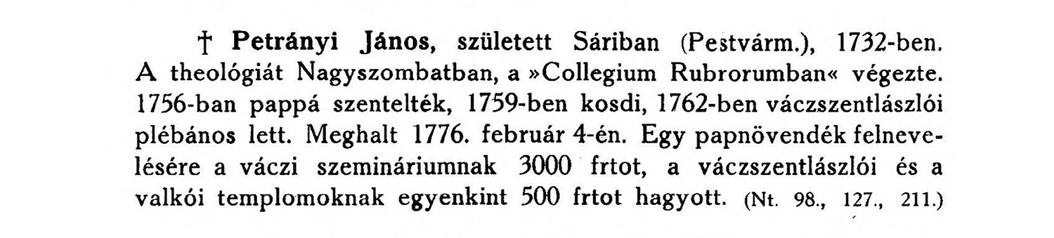 Pauer János (1814-1889) székesfehérvári püspök, egyházi író, akadémikus az 1847-ben kiadott „Az egyházi rend érdeme Magyarország történetében” című munkájában egészen az Árpádok időszakától lajstromozta, hogy mit is tett a klérus „a nevelés és oktatás, polgárzat és irodalom, szóval hazánknak minden tekintetbeni jólléte s fölvirágzására nézve.” Ebben a kivételes alaposságú és értékű összegzésben a 347. oldalon olvashatjuk: „Petrányi János plebános, a’ növendékpapok intézetének 3.000 ftot, a’ szent-lászlói, és valkói fiókegyházaknak 800 ftot” adományozott. Pauer János könyvének információja alapján Petrányi János gesztusa az 1860-ban kiadott Egyetemes Magyar Encyclopaedia II. kötetébe is bekerült, az „Alapítvány” címszóban.